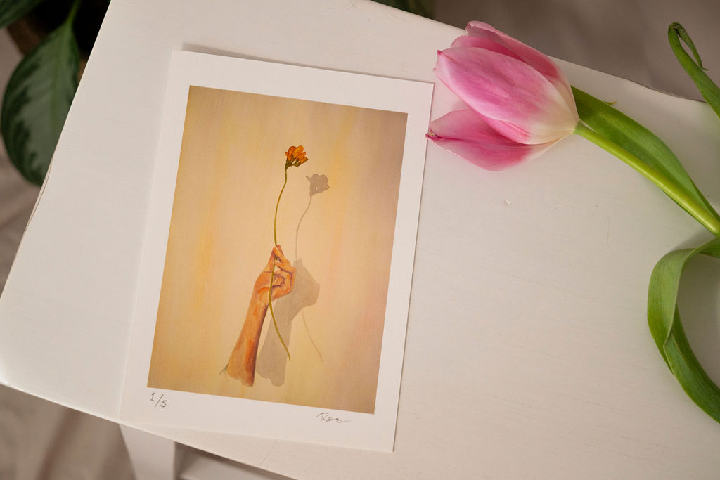 In this soft and luminous watercolor, a hand offers a delicate flower.