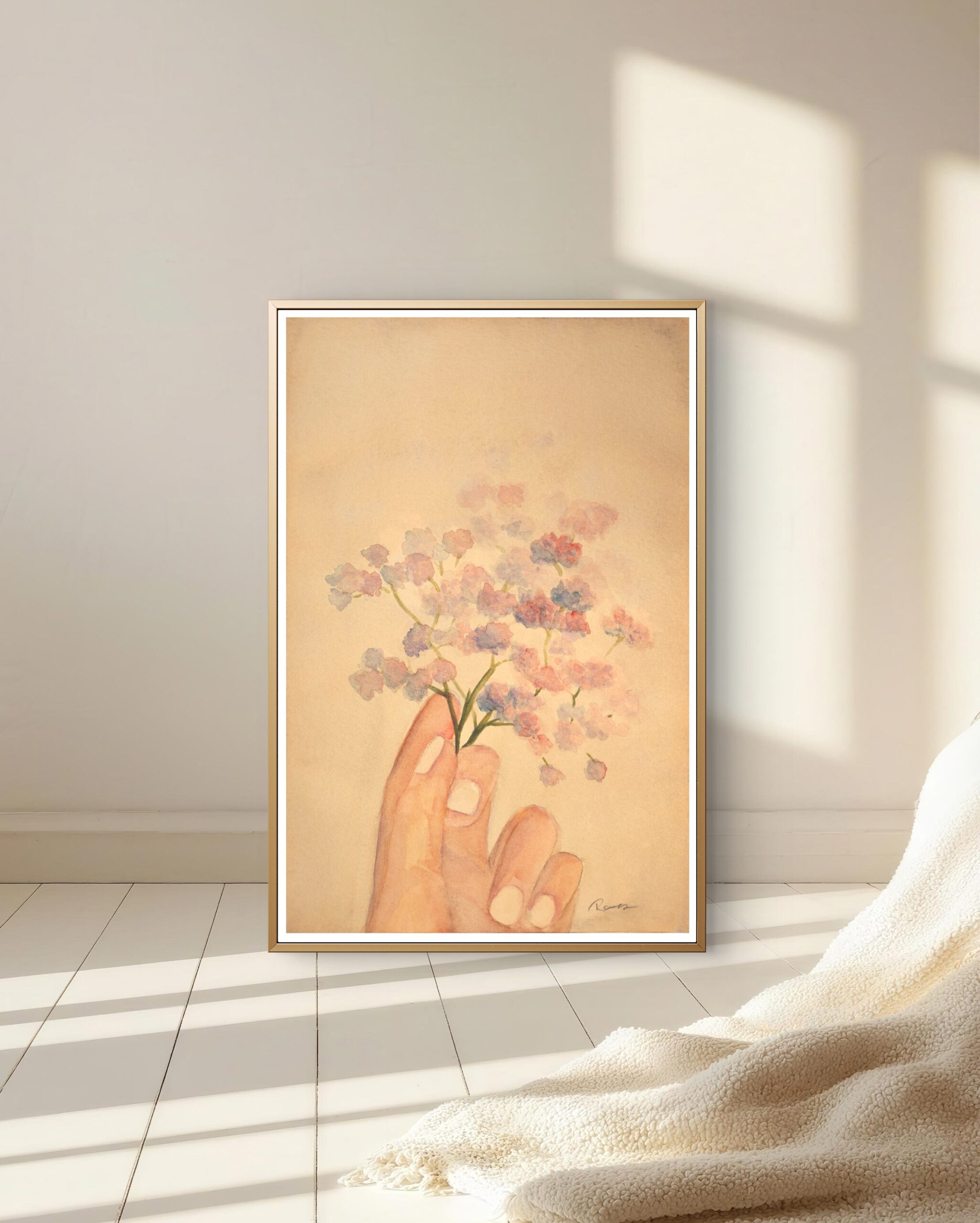 Entre ses mains délicates repose un bouquet de gypsophiles, léger comme un souffle. Les fleurs séchées portent en elles la mémoire des saisons passées, un parfum discret de nostalgie et de tendresse.